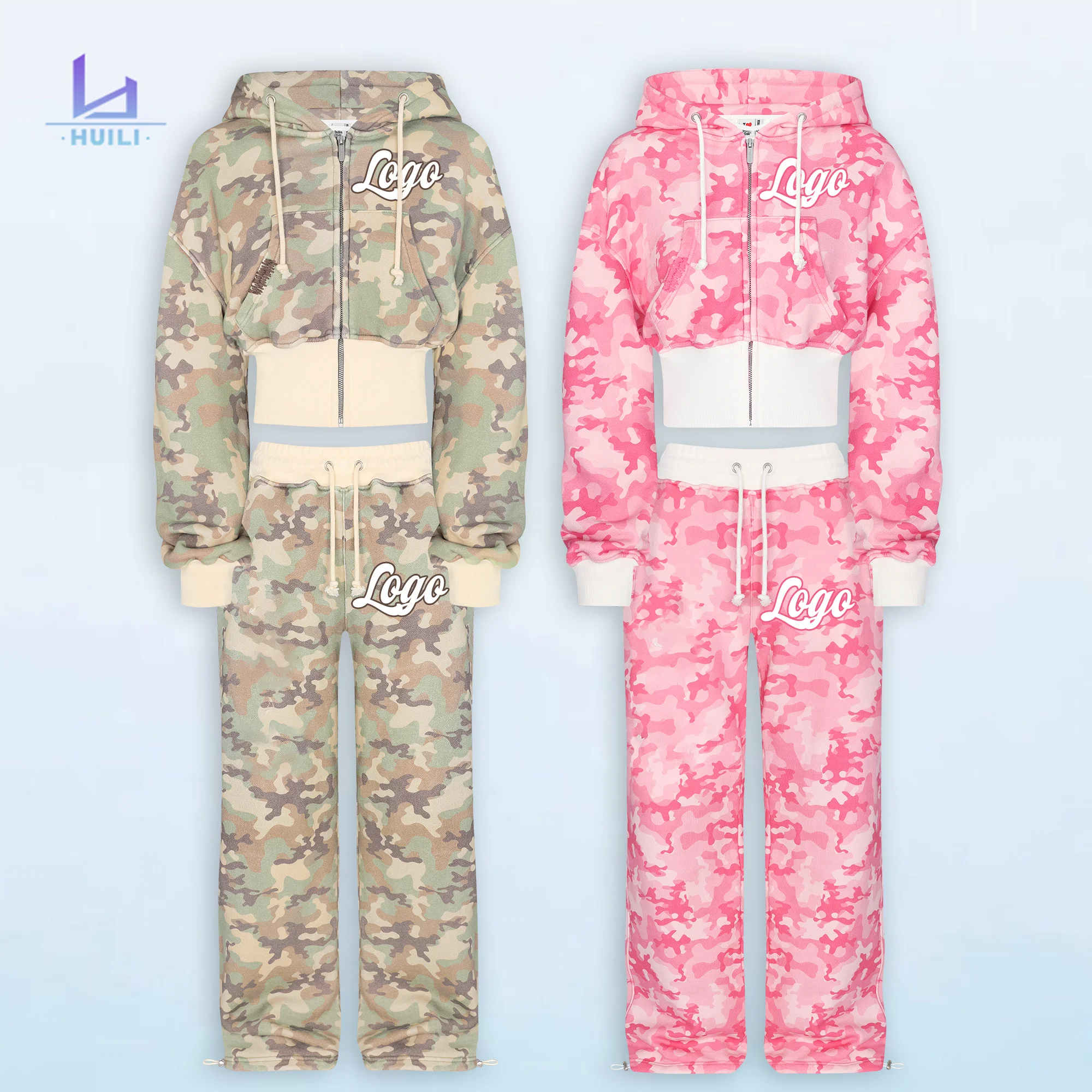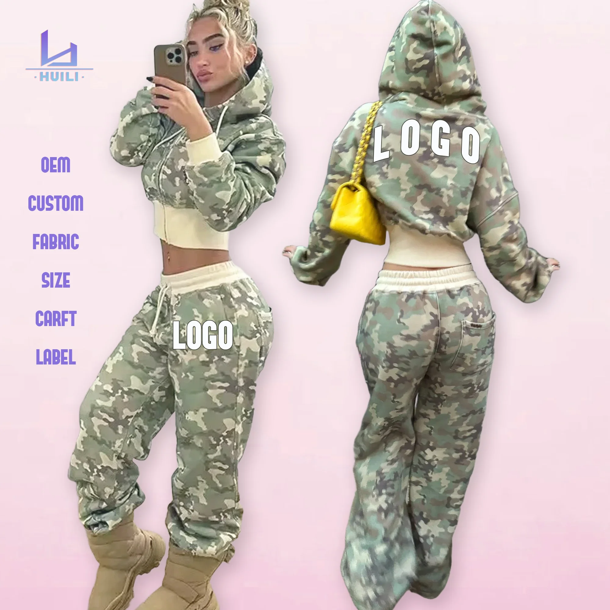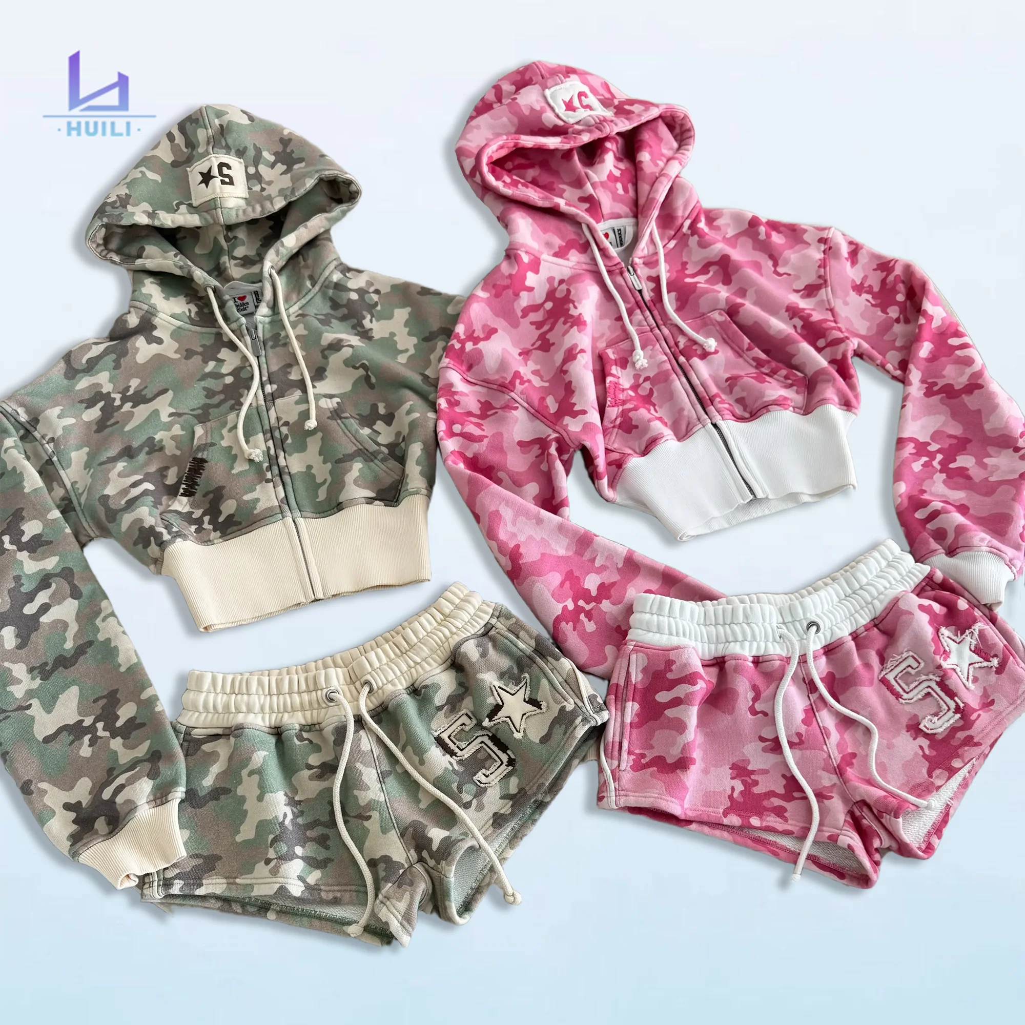 Huili Heavyweight Soft Cotton Wide Hem Crop Hoodie Shorts Two Piece Baggy Sweatpants Tracksuit Custom logo Camo Women Hoodie Set